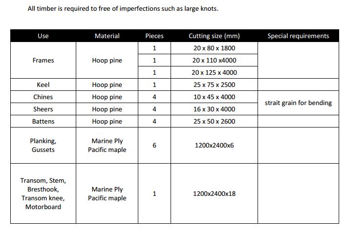 Cutting list (I got a kapur hardwood 20mm thick keel in the end) |