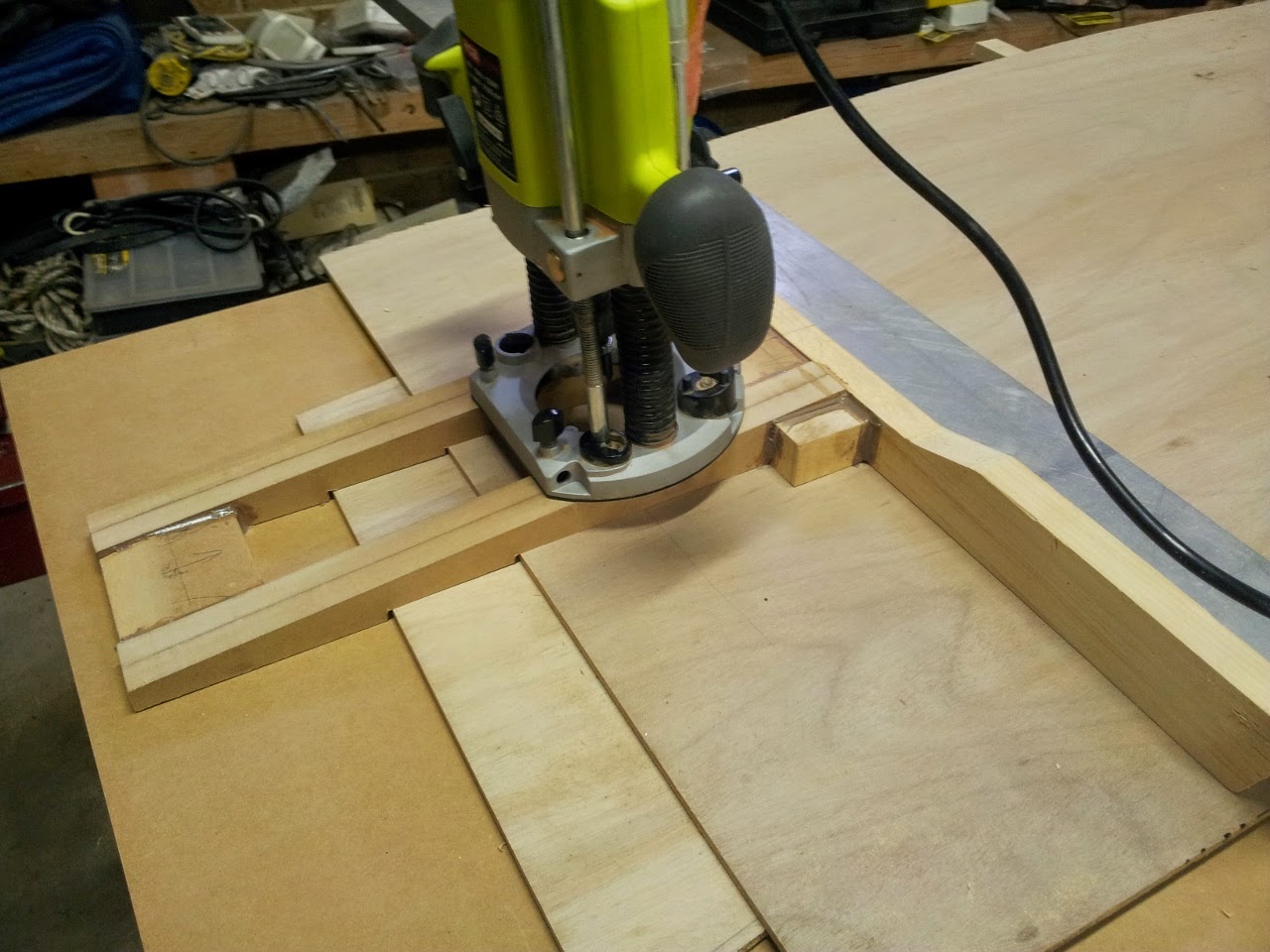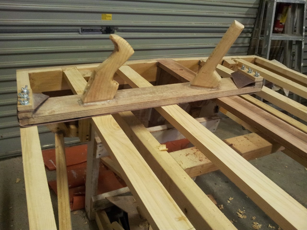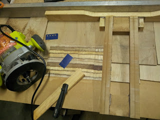 The scarfing jig worked perfectly on the first attempt and not as well on my second scarf joint, as can be seen by contrasting the photo below with the photo above. The plywood was a little bowed on the second attempt and a flaw in my jig is that it doesn't hold the plywood down to the table once the scarf is cut. I am confident that the jagged edge will not affect the quality of the scarf joint however.