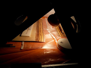Mounting a flat table top over my boat helped to facilitate the scarf jointing. A4 plastic sleeves were used to stop the joint gluing to the table.