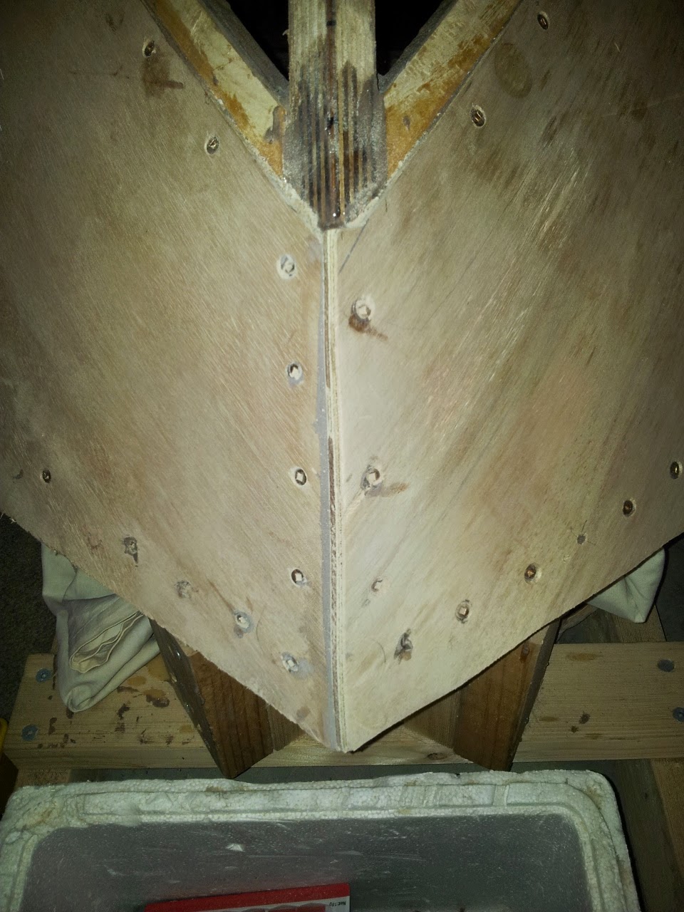 Note that I had already trimmed the plywood at the stem when it was dry fitted.