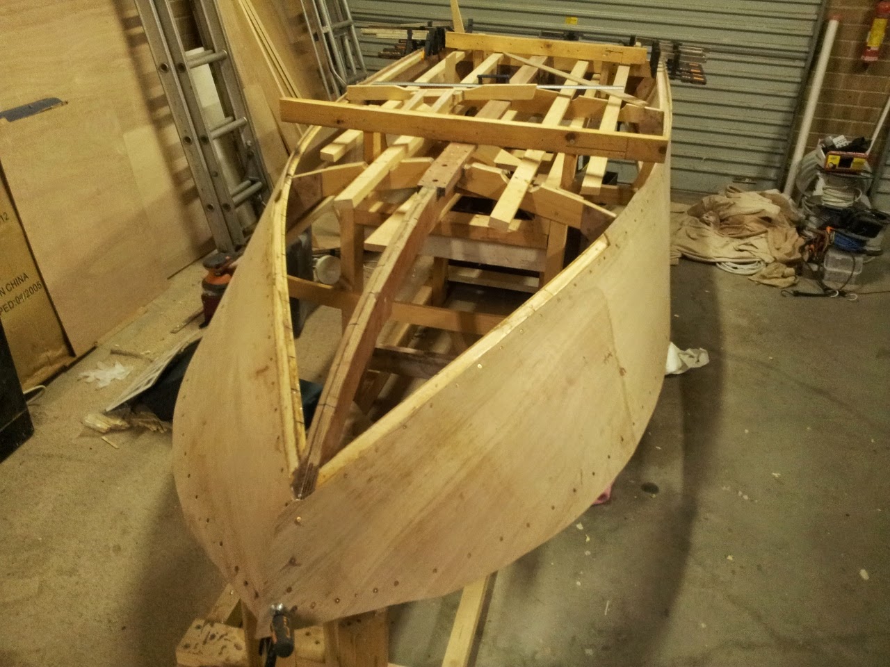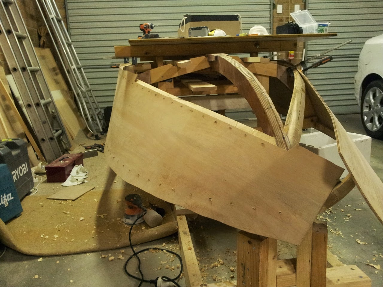 After the epoxy had cured, the plywood was trimmed and sanded at the front of the boat to form a curved line that hopefully will one day cut through the water like a knife through Camembert.