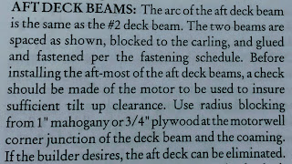 The quandary is how to know what curves to cut. The simplest solution would be to simply copy Frame 2 for the forward deck beams and then 'eyeball' the aft beams based on Frame 1 and the Transom. I suspect this 'eyeballing' method would have been fine especially given it all needs faring anyway and that epoxy can fill gaps admirably. I wasn't satisfied with that approach and wanted a more analytical way of developing the deck beams. Glen L Witt's book, 'Boat Building With Plywood' gives some methods of developing deck beams.
