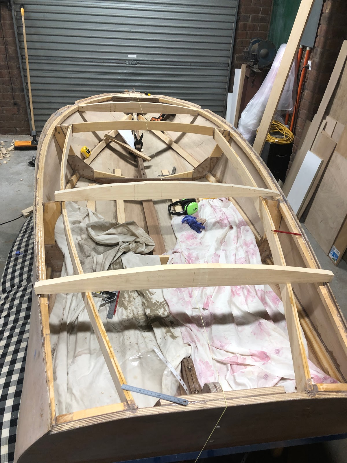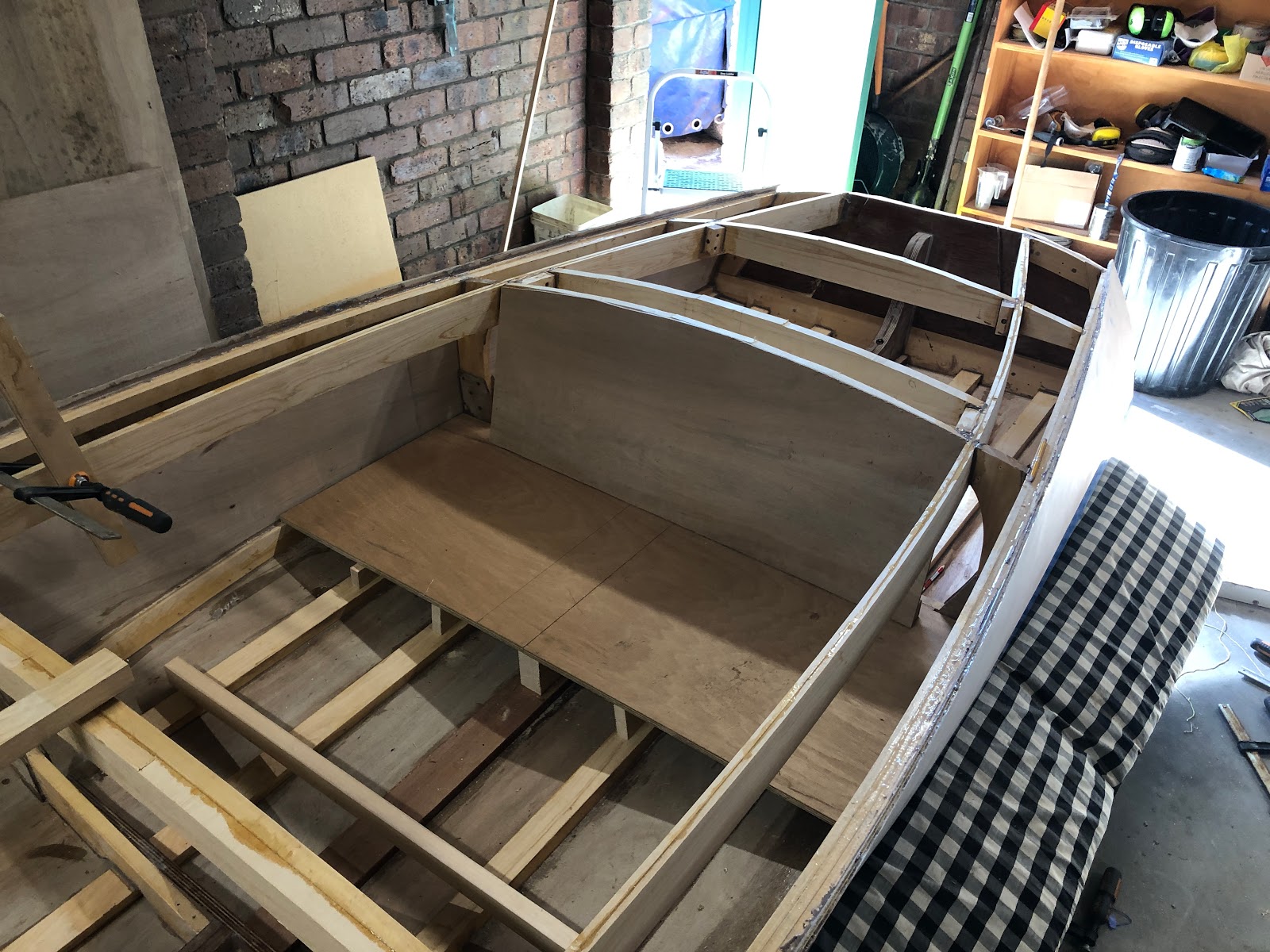 Extra pieces of hoop pine were added between each of the battens on the floor of the boat. This is to act as flooring. I still need to shape these extra floor battens to the curve of the hull which will be another angle grinder job. A seat was created by resting a piece of plywood on the chine timbers and then adding supports to the keel and battens. The supports are perpendicular to the battens and angled where they meet the seat. In hindsight it would have been more aesthetically pleasing to have them perpendicular to the seat. I am considering adding a decorative piece of wood to the front of the seat to hide the supports.