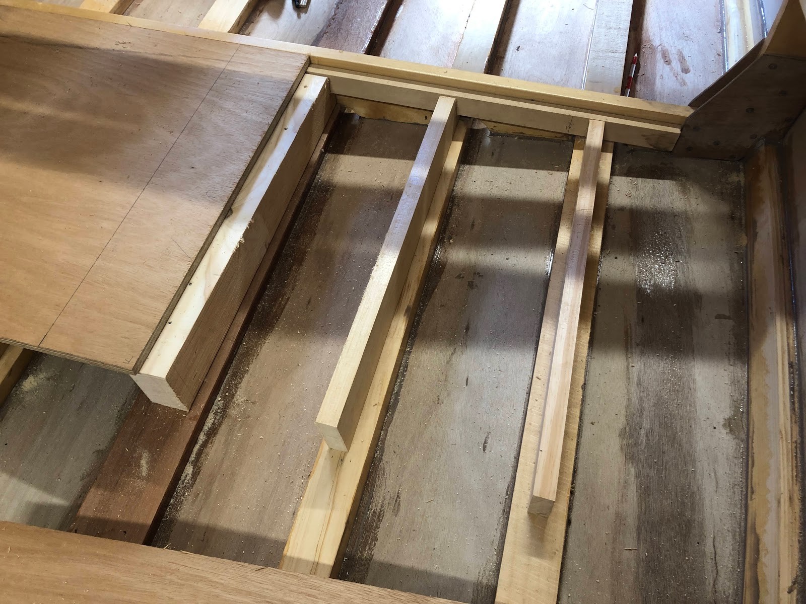 The front deck beam was supported by blocking to the sheer and an upright from the stem.