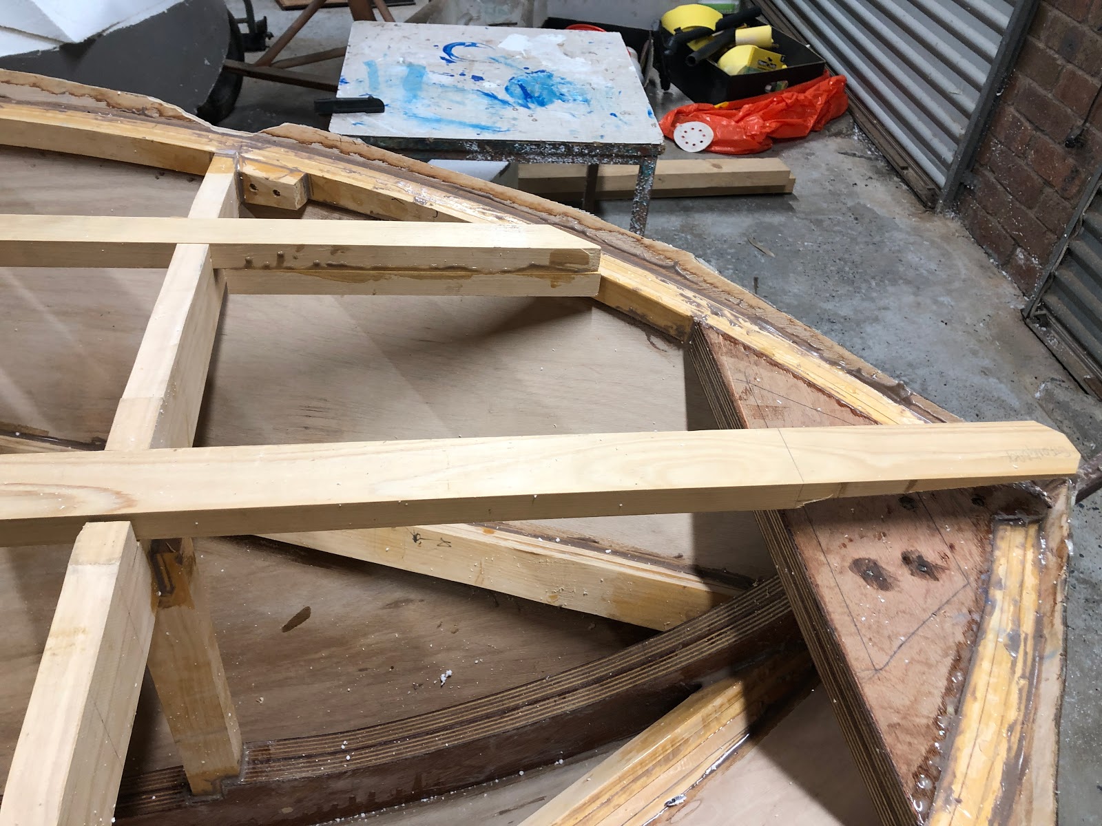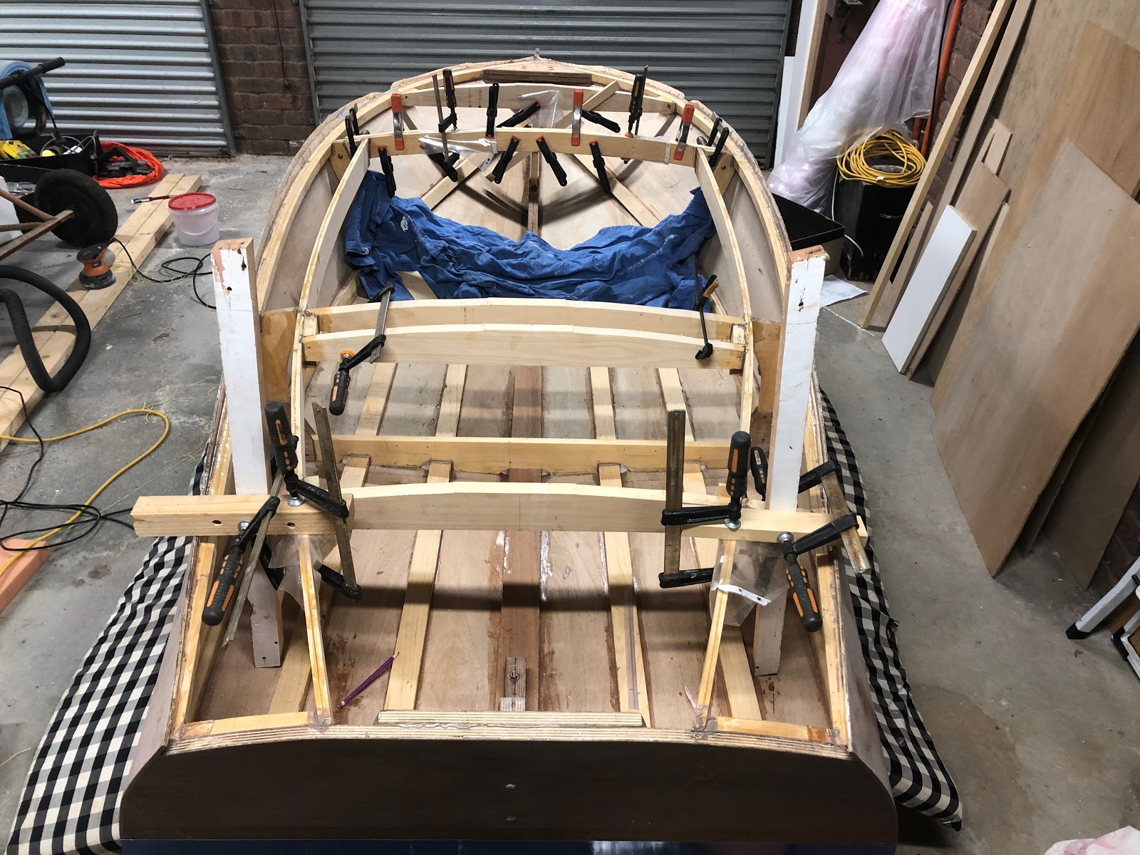 The glue-up of the rear deck beams was a bit tricky because I did not bother to create blocking for the 2 deck beam segments either side of the coaming. Hence in the image below there is some complicated clamping going on.