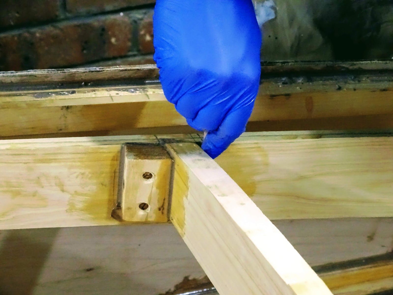 Epoxying the deck beam in place. |